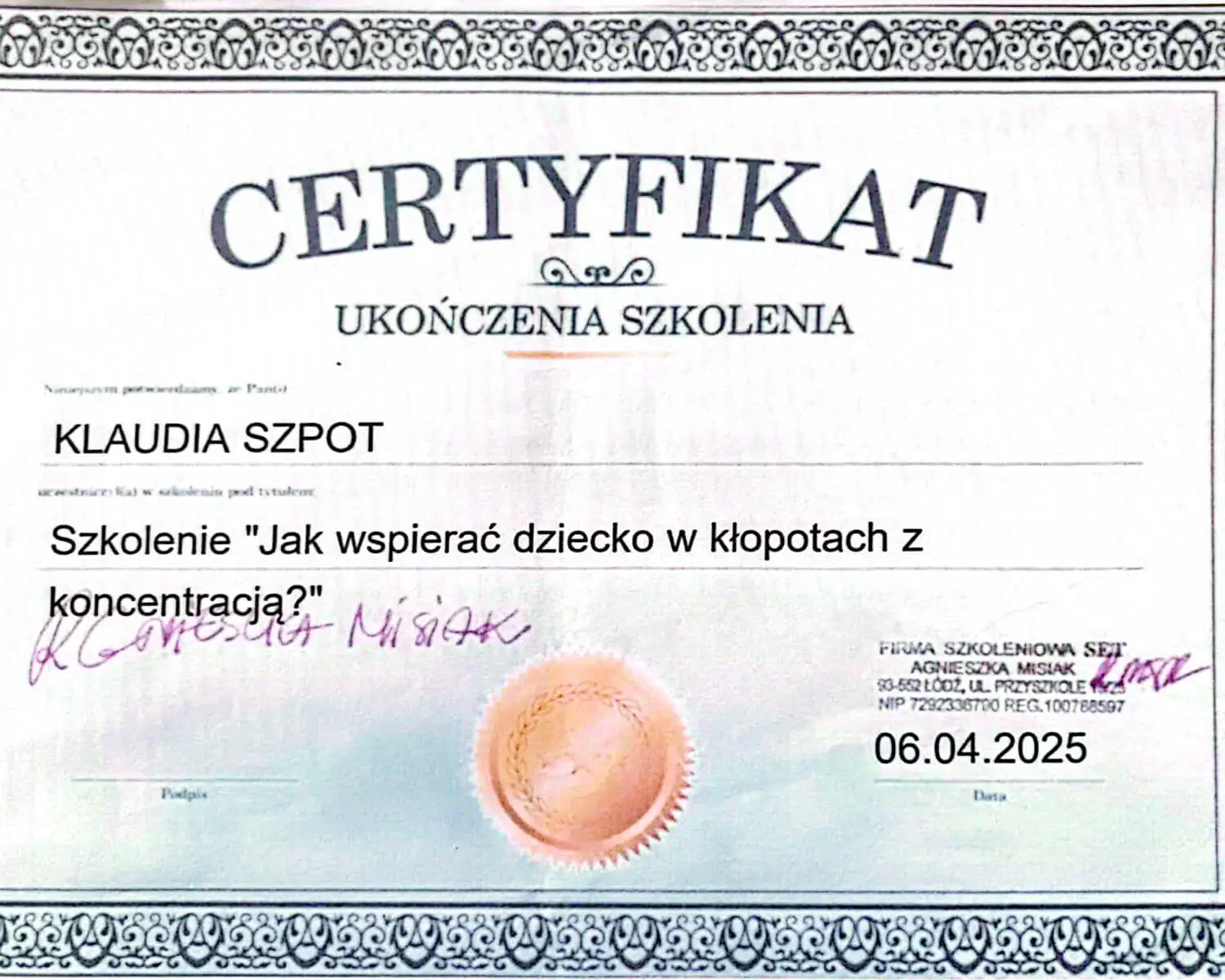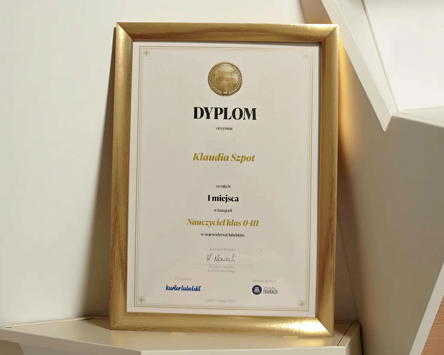 Jestem nauczycielem mianowanym, stale się szkolę i szukam nowych metod, które pomagają dzieciom szybciej zrozumieć materiał i poczuć satysfakcję z nauki. W 2024 roku otrzymałam nagrodę w prestiżowym konkursie Kurier Lubelski – Nauczyciel Roku – to wyróżnienie było dla mnie szczególne, bo przyznane głosami rodziców i uczniów, którzy docenili moje podejście i efekty pracy z dziećmi.